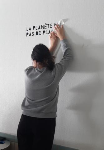 Leurs créations ont ensuite été mises en forme par l'artiste, puis les élèves sont allés les coller dans différents lieux de l'établissement : couloirs, cantine, cafétéria, vie scolaire, salles d'étude, CDI, etc.